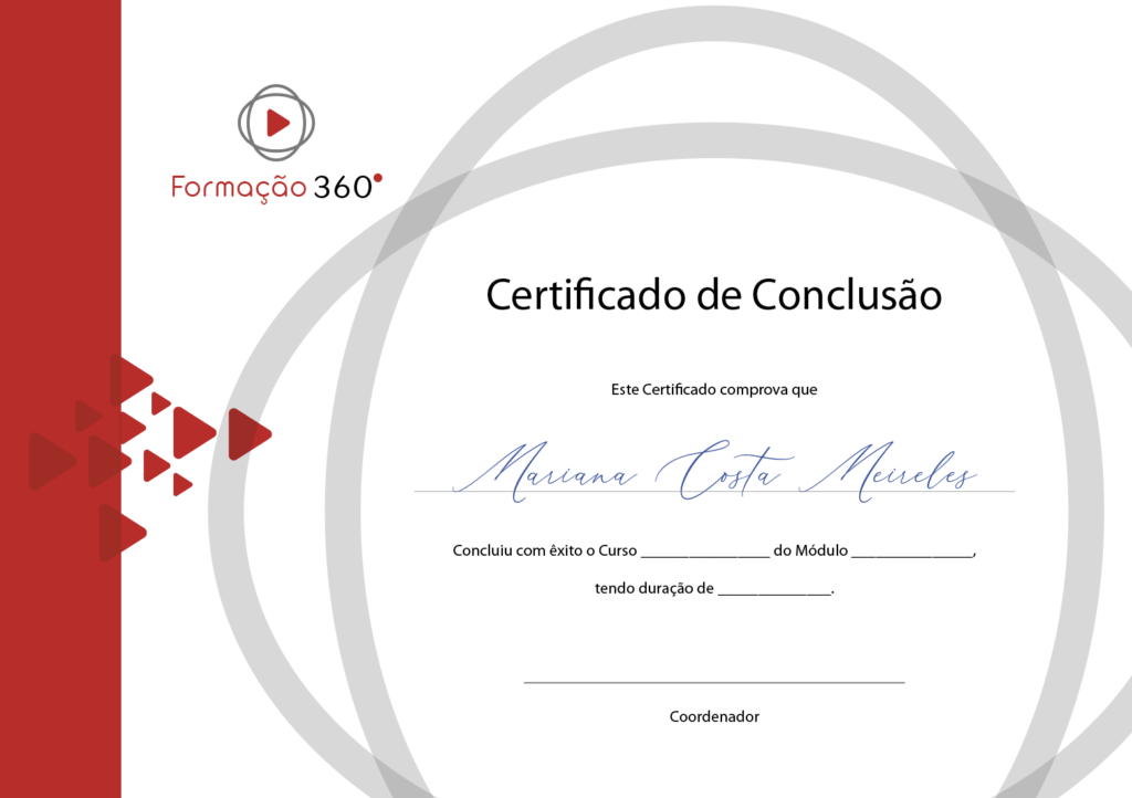 Ao concluir com sucesso o curso Formação 360º, você receberá um Certificado de Conclusão, comprovando sua participação e realização do curso.